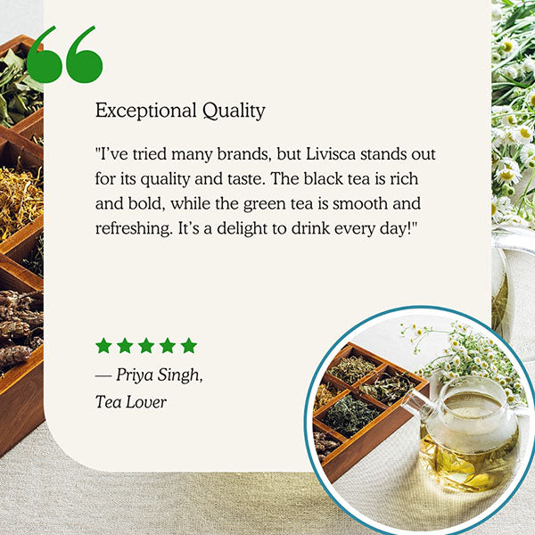 Livisca was born from a deep desire to offer more than just tea our mission is to offer wellness in every cup. With a passion for natural healing, we explored the finest tea gardens and selected premium Ayurvedic herbs to bring you a blend that calms the mind and nourishes the body.