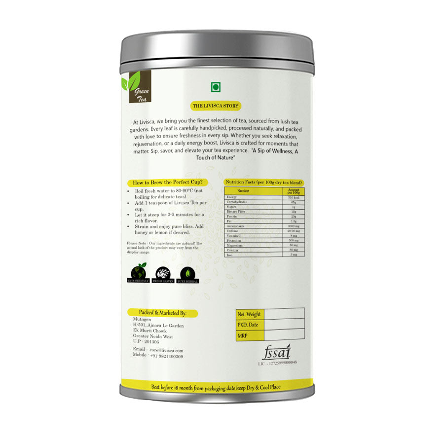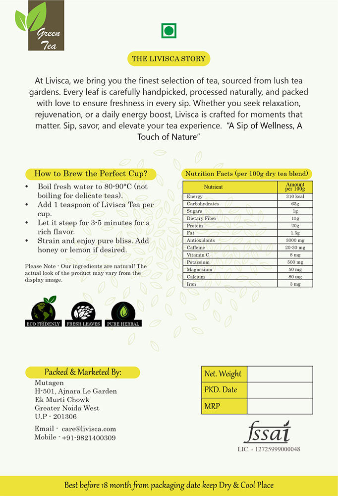 Livisca Tea combines premium green tea leaves with Ayurvedic herbs to create blends that not only taste great but support your wellness goals. Each tea is thoughtfully formulated, lab-tested, and free from artificial additives or preservatives.