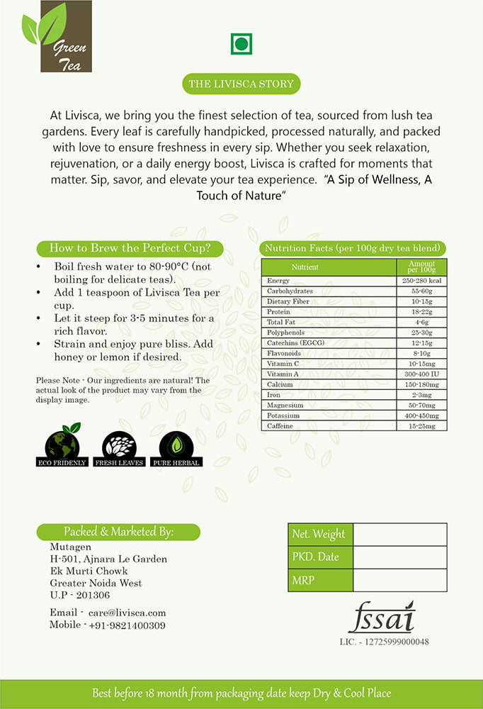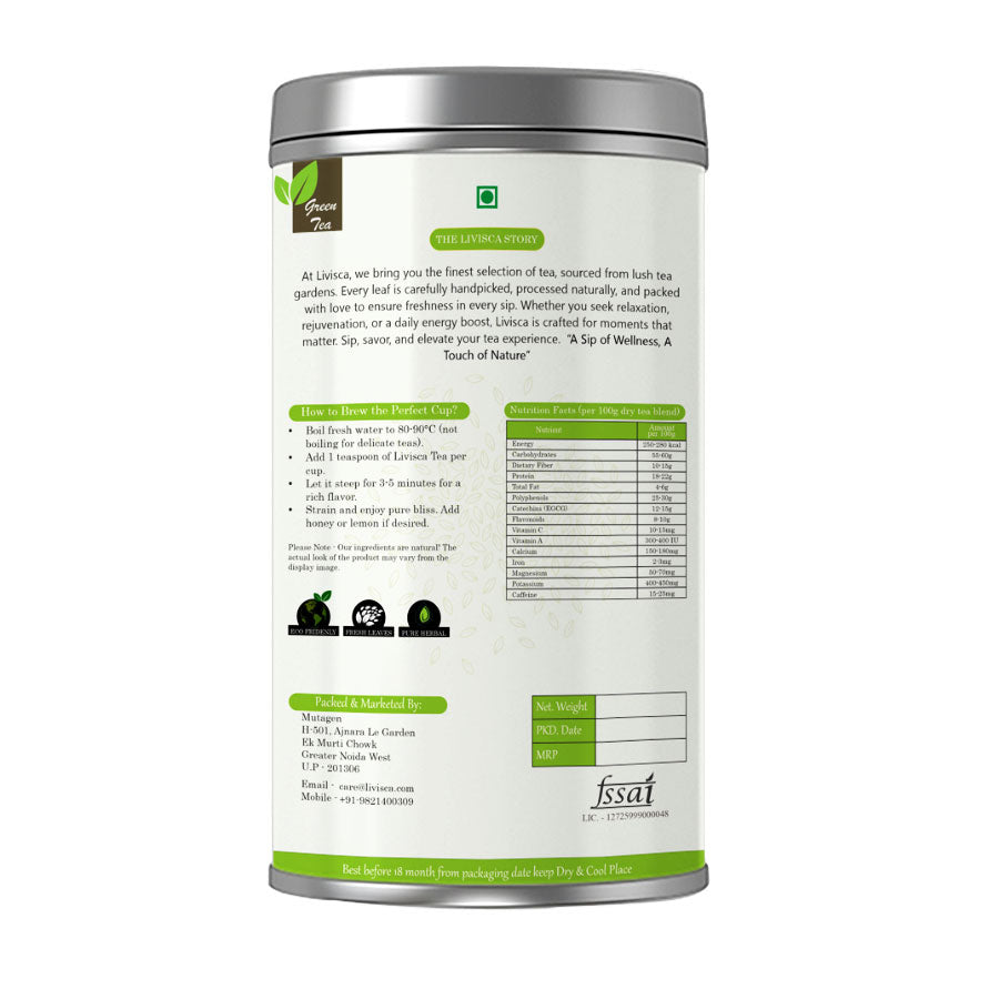 Livisca Tea combines premium green tea leaves with Ayurvedic herbs to create blends that not only taste great but support your wellness goals. Each tea is thoughtfully formulated, lab-tested, and free from artificial additives or preservatives.