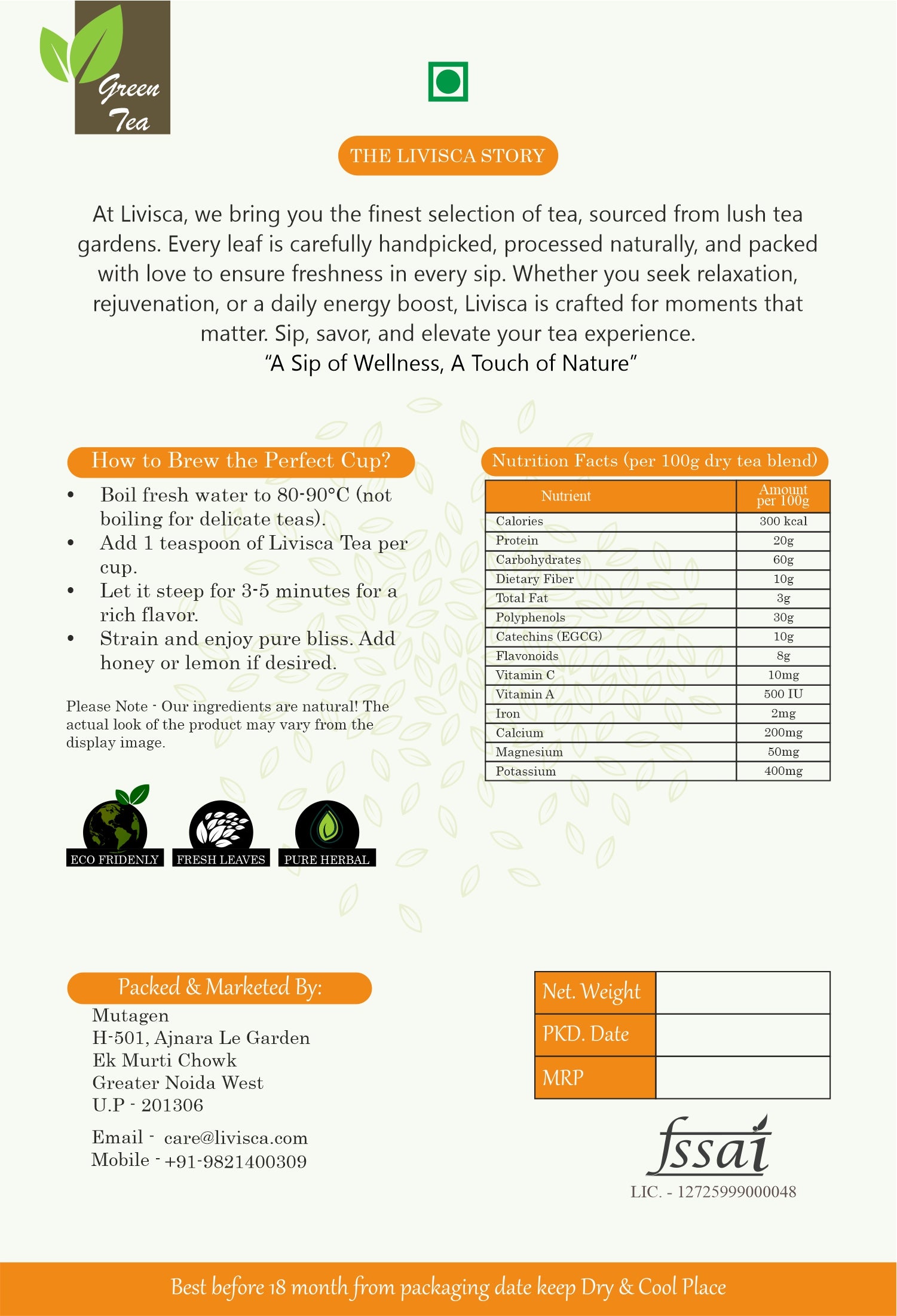 Livisca Calendula & Green Tea is designed for those seeking a premium herbal tea to enjoy as part of their wellness lifestyle. Its light flavor and calming aroma make it perfect for morning refreshment, afternoon breaks, or evening relaxation.