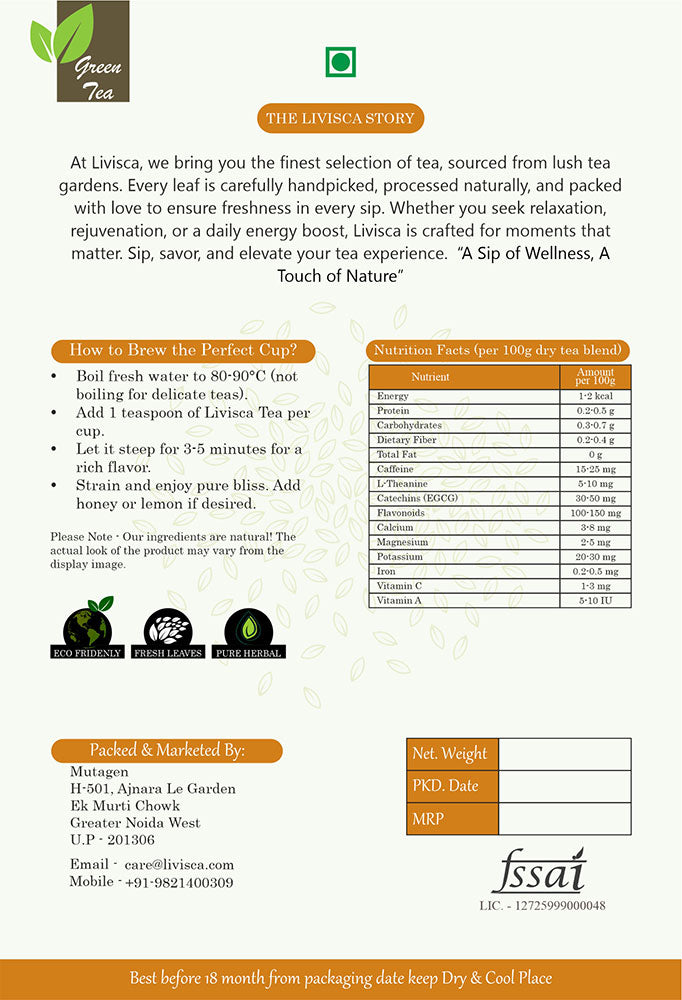 Livisca Tea combines premium green tea leaves with Ayurvedic herbs to create blends that not only taste great but support your wellness goals. Each tea is thoughtfully formulated, lab-tested, and free from artificial additives or preservatives.