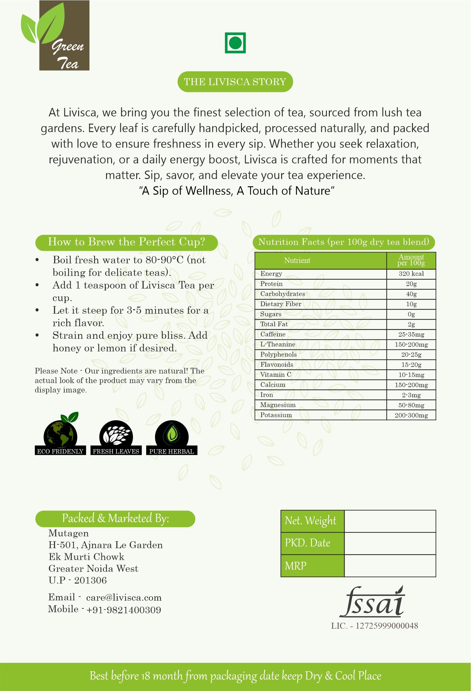 Experience the gentle, soothing flavor of Livisca Passionflower Green Tea, a premium herbal infusion that blends organic passionflower with high-quality green tea leaves. This carefully crafted tea provides a refreshing, calming experience that fits seamlessly into your daily wellness routine.