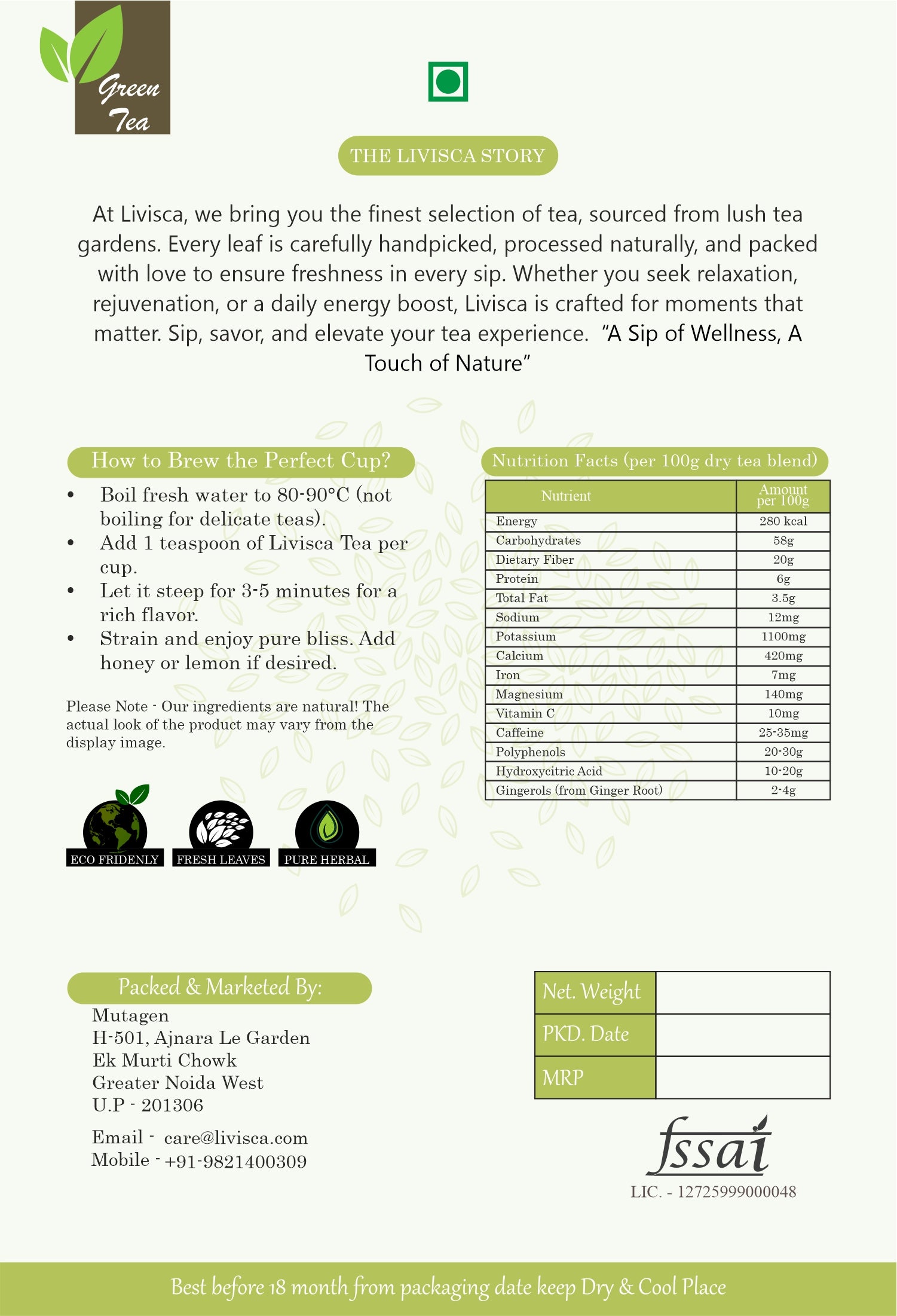Our Weight Loss Support Tea is a premium blend of carefully selected organic herbs and natural ingredients designed to help you achieve your weight loss goals. Combining the powerful fat-burning properties of green tea and ginger with digestion-boosting peppermint and fennel, this tea not only supports metabolism but also curbs cravings and enhances digestion.